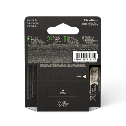 Introducing GP Recyko: a new-generation rechargeable battery that is better for you and better for the earth. As the future battery for your daily life,1 GP Recyko battery saves 200 single-use batteries. You don’t have to keep buying and disposing off batteries. You can get better value while generating less waste and contribute to sustainability in your daily life.